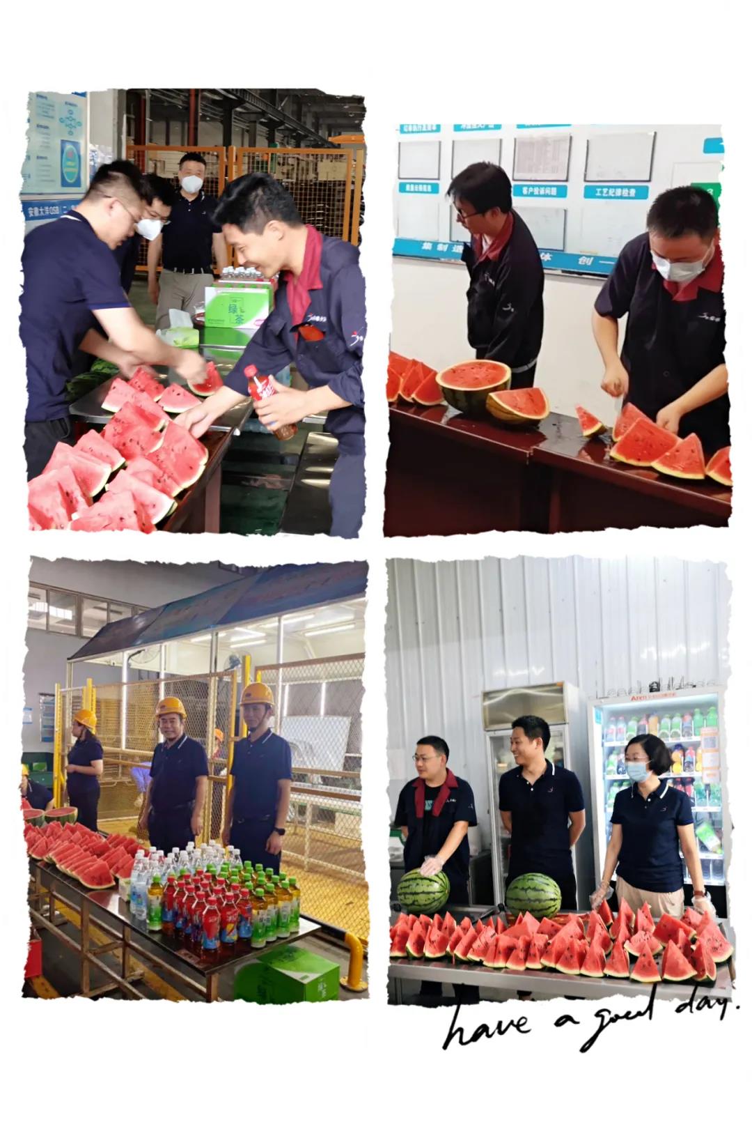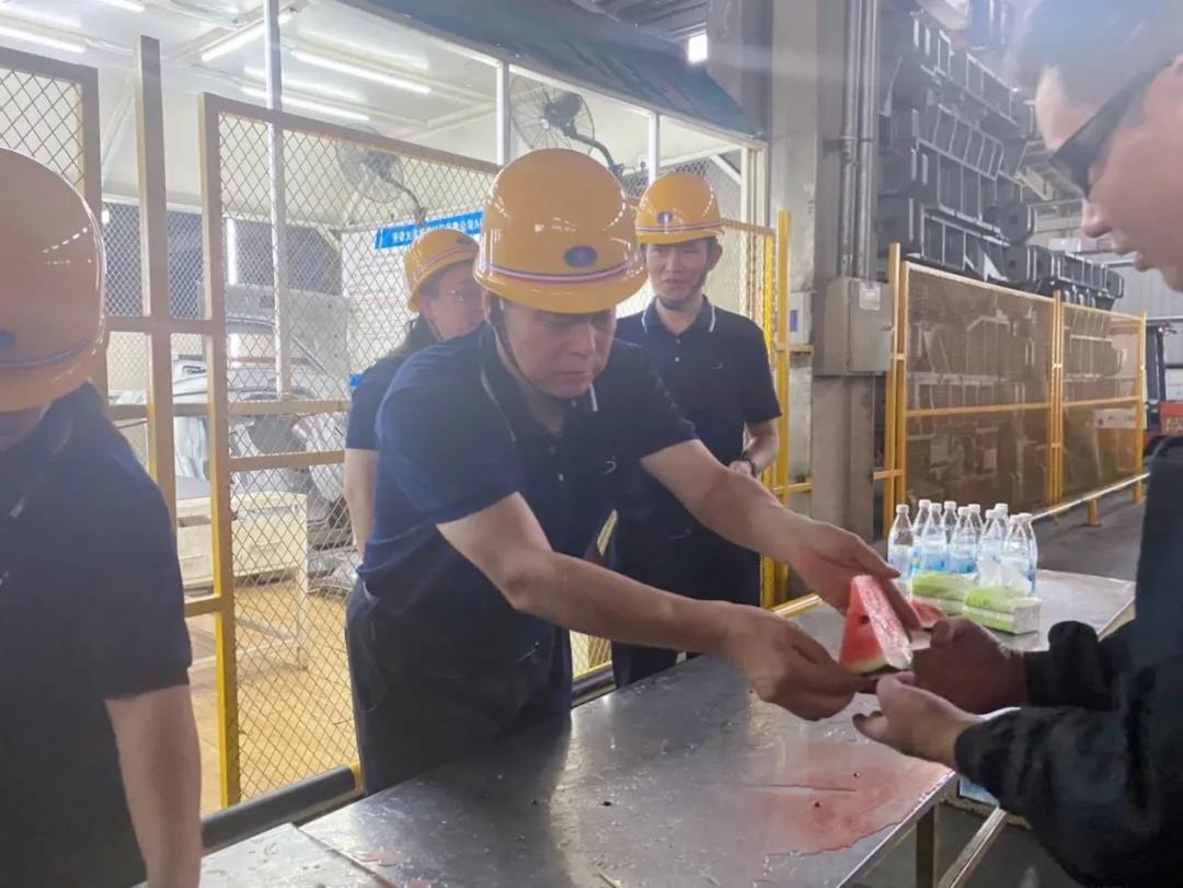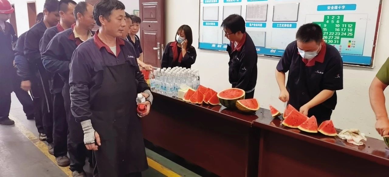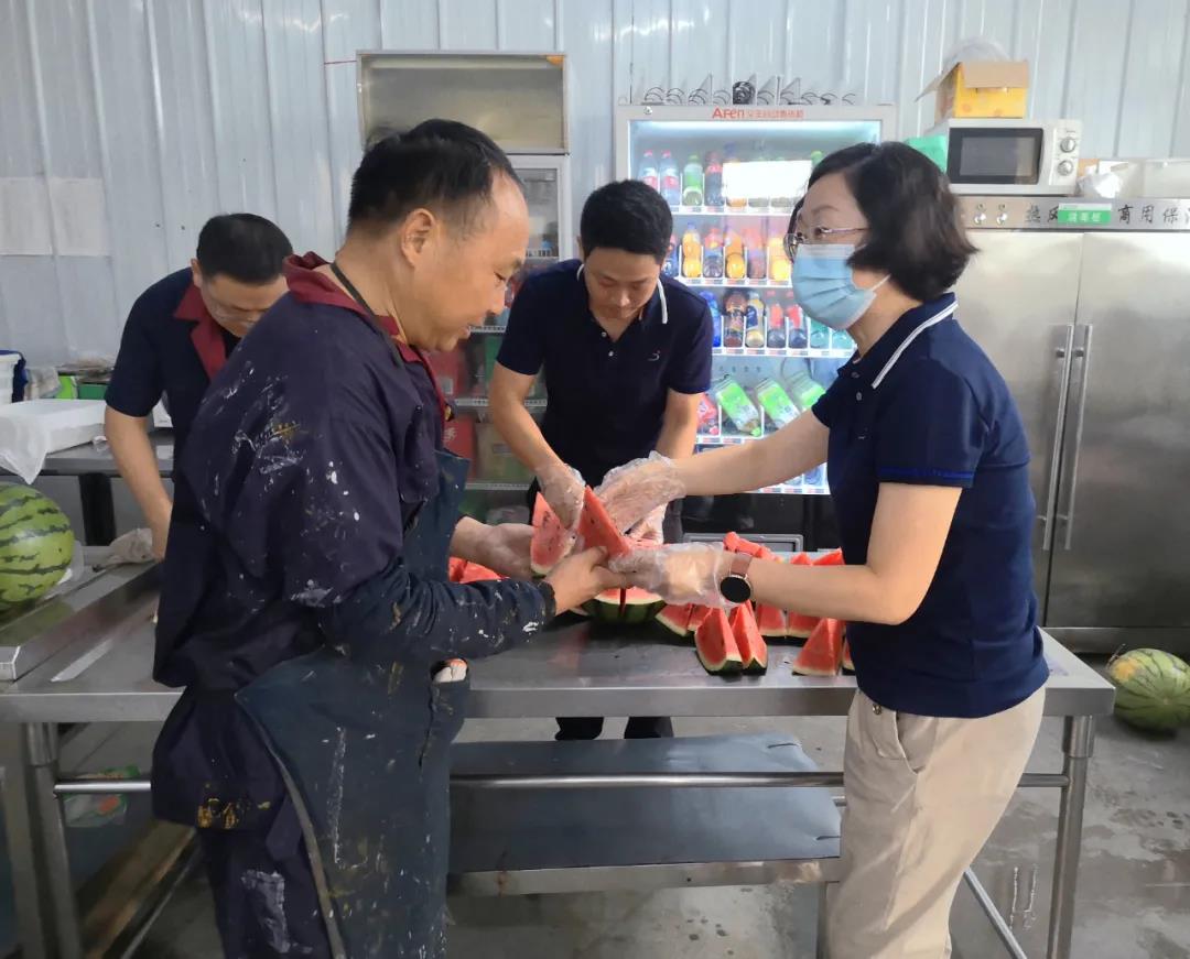 公司各領(lǐng)導(dǎo)們?yōu)閳允卦诳崾钪凶鳂I(yè)的一線職工帶來了清甜的西瓜、冷飲等防暑降溫物品。