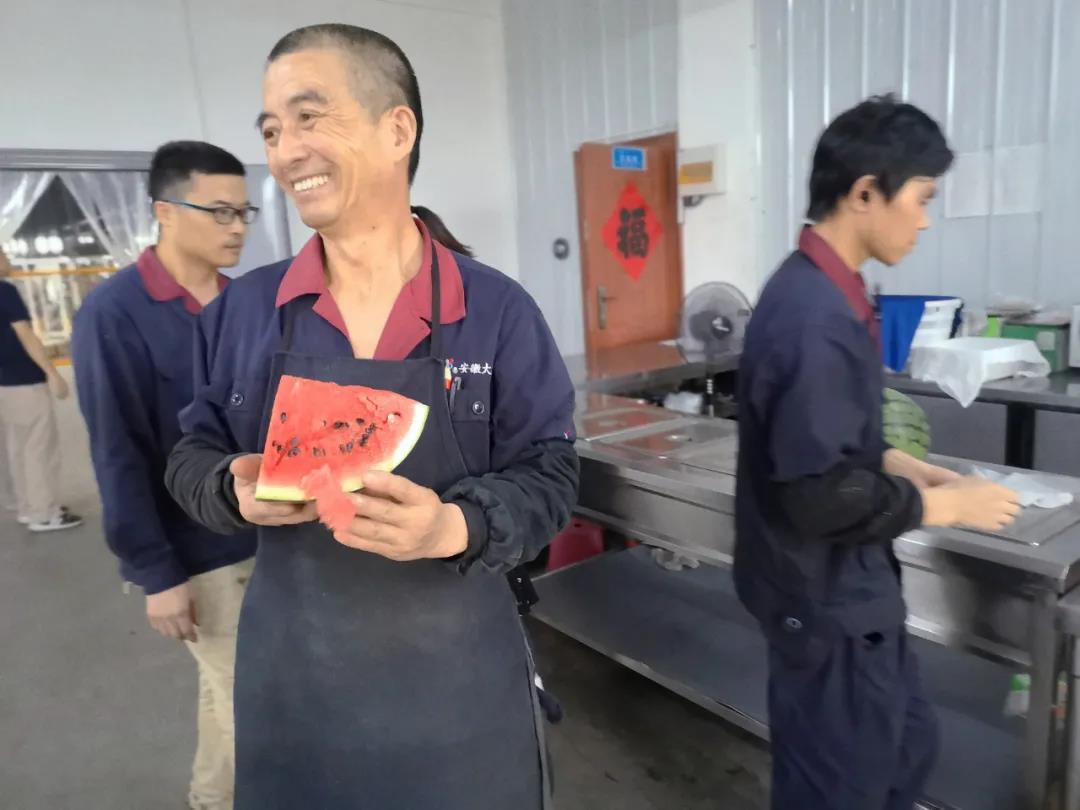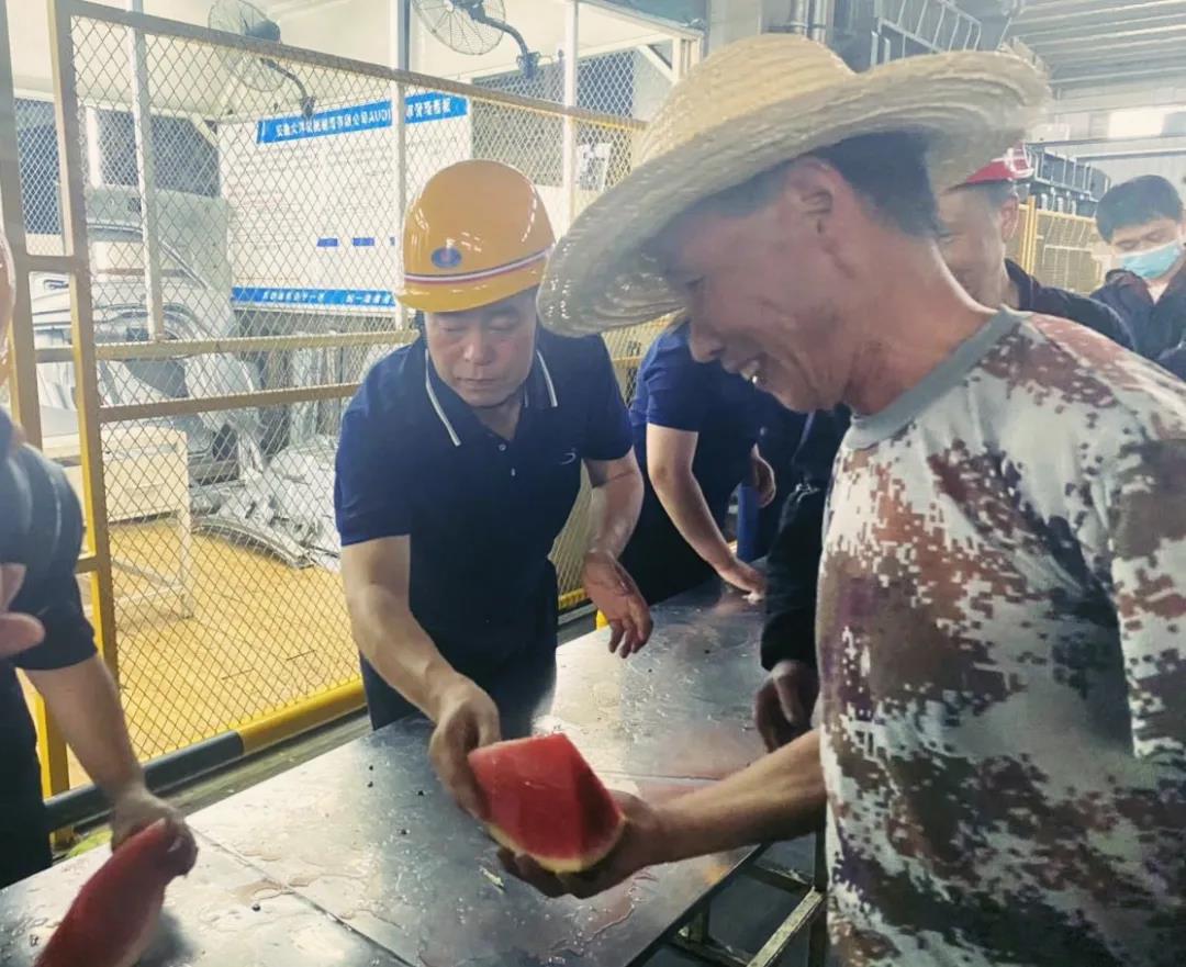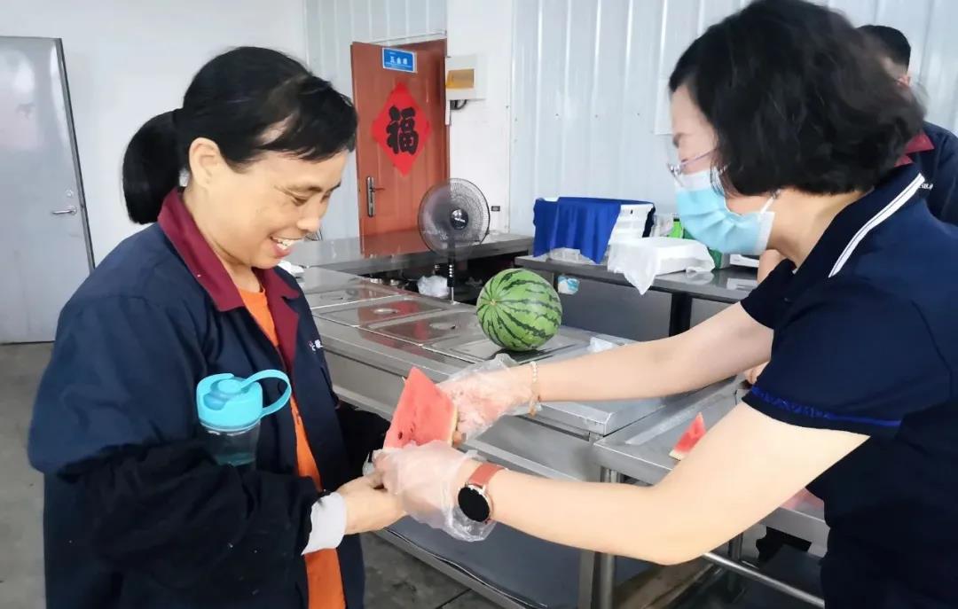 公司各領(lǐng)導(dǎo)們?yōu)閳允卦诳崾钪凶鳂I(yè)的一線職工帶來了清甜的西瓜、冷飲等防暑降溫物品。